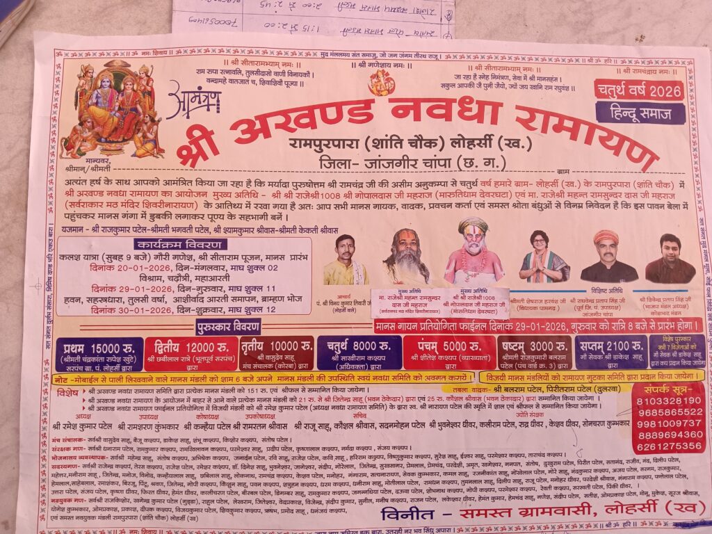जांजगीर चांपा जिले के पामगढ़ क्षेत्र के ग्राम पंचायत में अखंड नवधा रामायण का आयोजन किया गया है जहां पर लोग नवधा रामायण सुनने के लिए आ रहे है